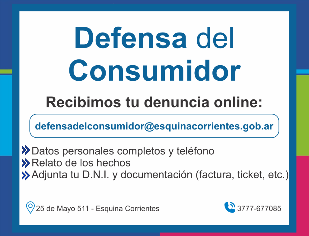 Puede hacerlo en la Oficina Municipal de Información y Defensa de Usuarios y Consumidores (25 de Mayo 511, Esquina Corrientes), también por correo electrónico: defensadelconsumidor@esquinacorrientes.gob.ar, o mediante WhatsApp (3777677085).